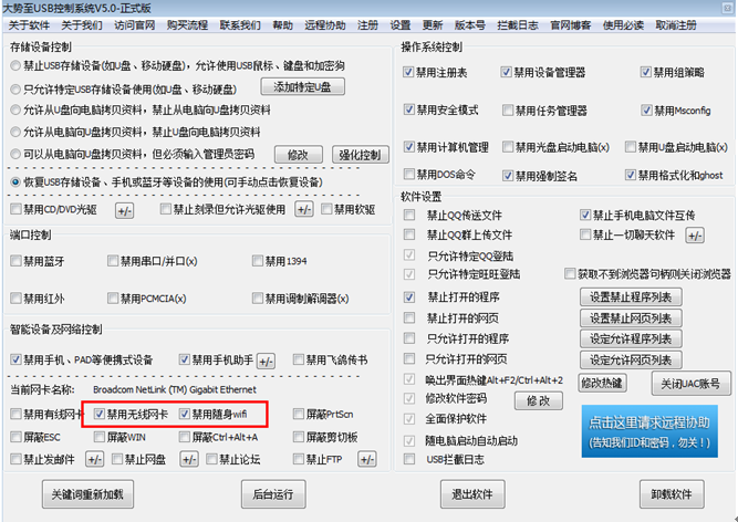 软件大概5MB多,下载后就直接安装了,全程只用了几秒钟,我只需要禁止员工私自安装随身wifi,所以我只勾选了“禁用无线网卡和禁用随身wifi”,即下图红色圈出的地方。