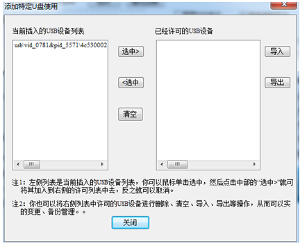 其中添加指定U盘这一项,先要插上U盘,这里会自动识别U盘序列号,点击选中,即添加成功,那么这台电脑就只识别这个U盘了,其他任何U盘连接电脑,都无法拷贝资料。