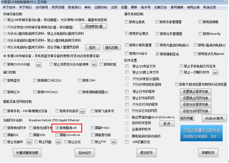 “大势至USB控制系统”这款软件较大的亮点就是安装操作简单,控制效果也是极好的,控制随身WIFI这个功能,只需要点一下鼠标,勾选这个项目即可。完全没有任何复杂的操作。如图所示: