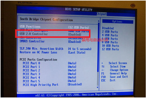 通过BIOS禁用移动存储设备是一种简单有效的方法,设置也相对简单。一般是在电脑开机的时候按住Del键即可进入BIOS里面,然后就可以通过BIOS禁用USB端口、BIOS禁用光驱、BIOS禁用PCI卡等,这样就可以完全禁止USB存储设备、禁用光驱等移动存储介质(尤其是USB移动光驱)。进入BIOS里面进行设置,默认是Enable,在这里回车,即可选择“Disabled”,然后就可以完全禁用USB端口了,如下图所示: