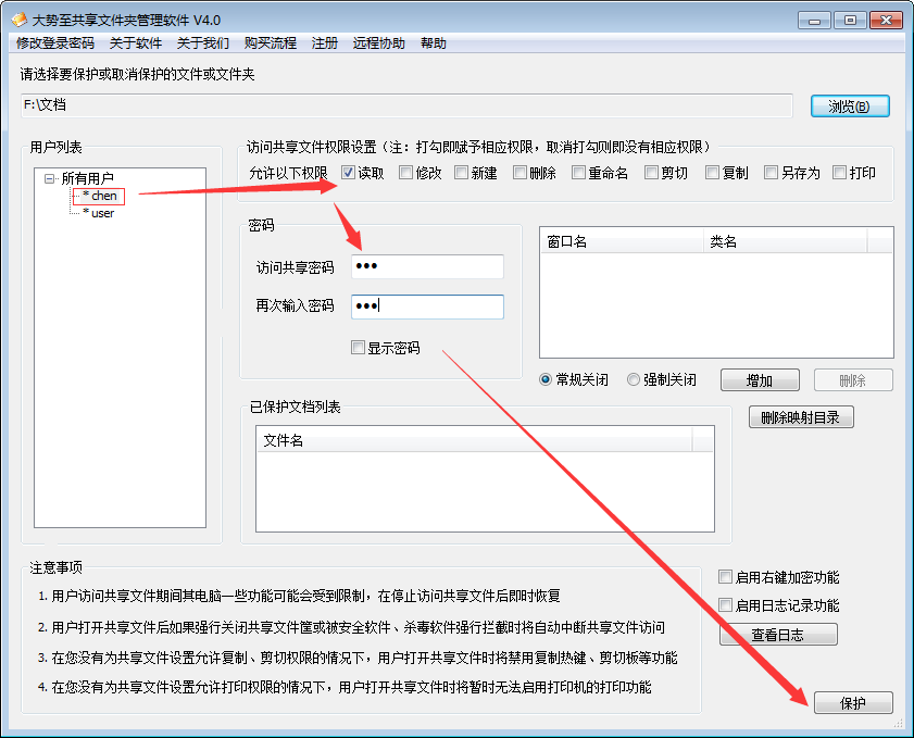 设置完毕之后,还可以随时修改共享文件访问权限,只需要在顶部访问权限哪里打勾或取消打勾,然后点击右下角的“保护”即可成功变更权限。