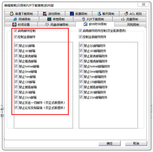 另外,在企业重要文件安全防护方面,聚生网管还有以下几个功能,其中包括禁止发邮件,可以封堵当前主流的全部邮箱,还可以单独禁止邮箱上传附件的功能。如图所示: