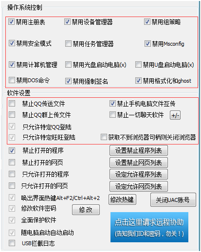 此外,大势至USB端口屏蔽软件还可以禁止计算机管理、禁用组策略、禁用开机启动项、禁止U盘启动电脑、禁用光驱启动电脑以及禁止开机按F8键进入操作系统安全模式等等,从而全面保护电脑自身安全,防止通过修改操作系统配置达到重新可以启用相关功能的目的,同时也防止了用户试图修改或破坏操作系统相关配置的行为,如下图所示: