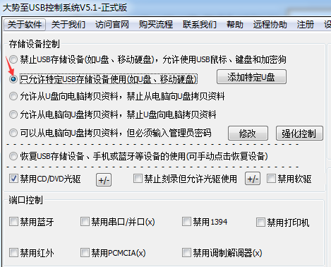 首先,我们需要将软件默认的“禁用USB存储设备”的选项切换到“只允许特定USB存储设备”,如下图所示: