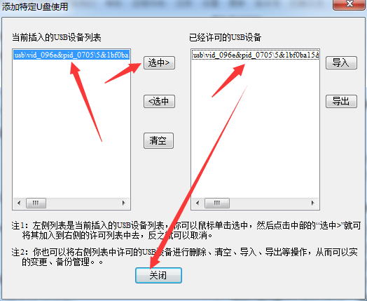 然后点击后面的“添加特定U盘”,然后在左侧的“当前插入的USB设备列表”中选择当前插入的U盘ID之后,点击中间“选中”按钮,即可成功添加到右侧的“已经许可的USB设备列表”,然后点击下面的“关闭”即可,如下图所示: