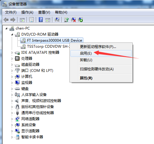 有时候,网银U盾的光驱被禁用之后并不会显示禁用标志,这个时候你需要选中网银U盾光驱之后,右键点击,如果显示“启用”则说明被禁用了,直接点击“启用”即可。如下图所示: