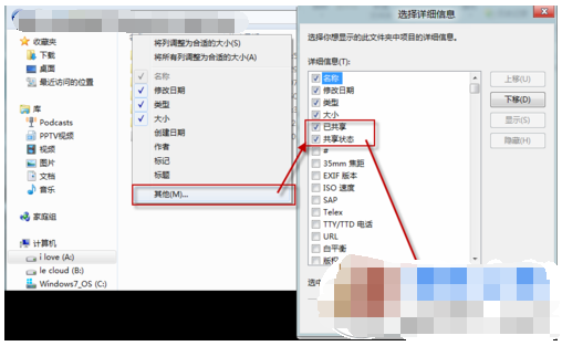 然后在文件夹的标题行中,单击鼠标右键,在弹出的对话框中选择其他,这样会看见一个“选择详细信息”的对话框,这里我们找到并勾选“已共享”和“共享状态”两个选项(图中小编已经勾选过了,所以两者显示在了一起),然后单击确定完成设置。