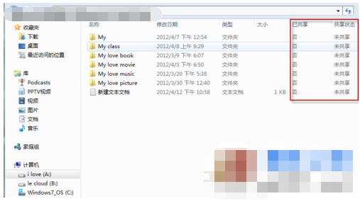 这样,我们就可以在详细信息视图下清楚的看出哪些文件夹已经共享,那些文件夹共享状态为专用了。