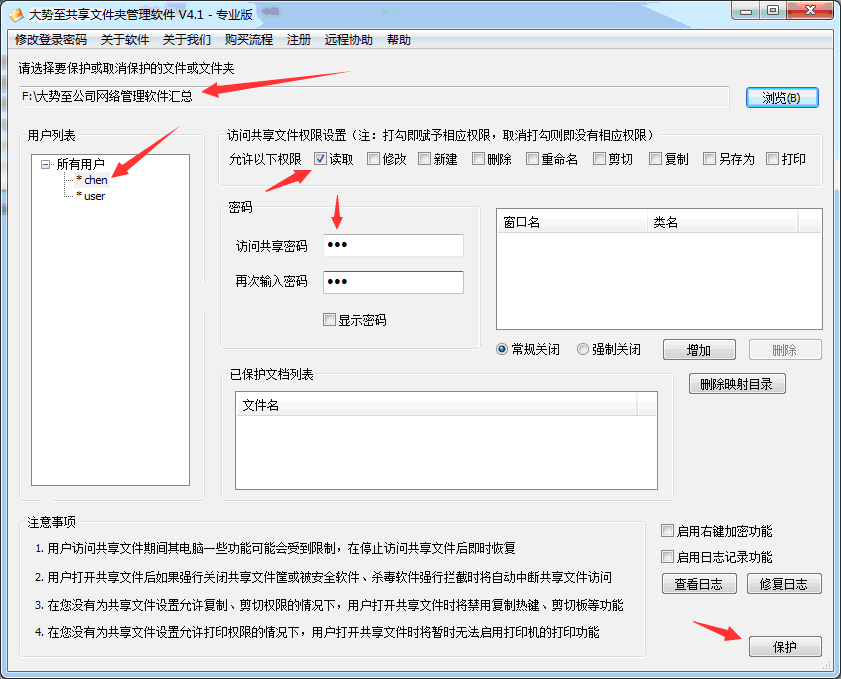 总之,有效保护共享文件的安全,一方面可以为共享文件夹设置访问密码,同时控制访问共享文件的权限,另一方面也可以借助于专门的管理共享文件访问的软件,从而实现共享文件的全面访问控制。