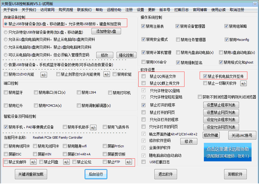 特别指出的是,大势至USB控制系统还集成了禁止QQ传输文件、禁止QQ群文件共享以及禁止手机电脑文件互传、禁止电脑手机无线传输文件的功能,从而更为严密地实现了电脑文件安全的管控,防止通过各种隐秘的通道泄露电脑文件的行为。如下图所示: