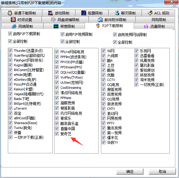 图:聚生网管禁止P2P下载、禁止爱奇艺视频