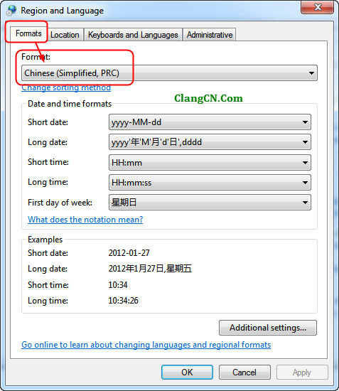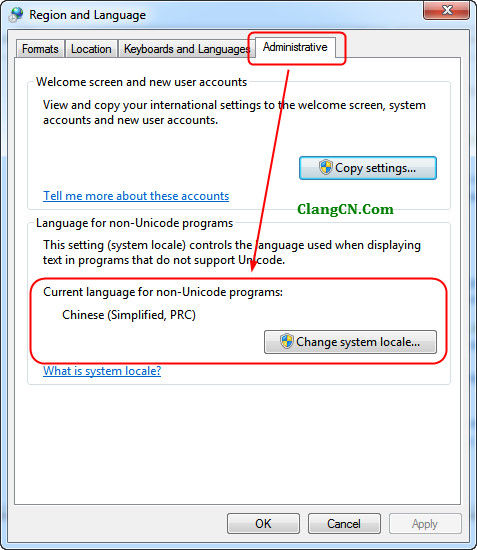 4、切换到Administrative选项卡,点击Change system locale按钮,将Current system locale改为Chinese(Simplified,PRC),点击“Apply”应用设置,如图所示: