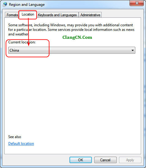 3、切换到Location选项卡,修改Current Location为China,如图所示: