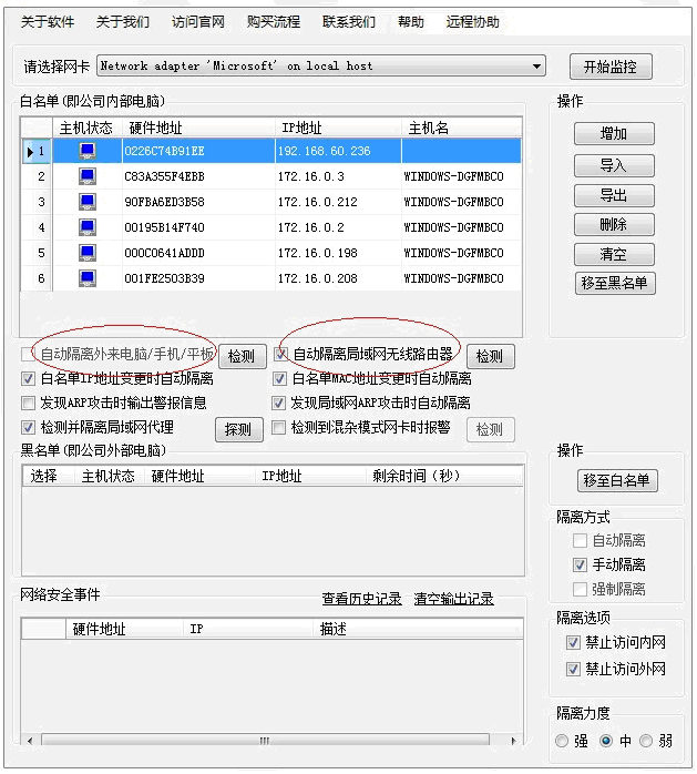 首先选中对应的网卡,点击“开始监控”,系统会自动扫描局域网的所有电脑,先显示在黑名单中,然后我们根据需要将允许上网的电脑移至白名单中,或者全部选中、全部移至白名单中(白名单即允许上网的电脑)。如果外来电脑、手机或者平板接入局域网,必须先通过管理员授权方可接入,还可以直接勾选“自动隔离外来电脑/手机/平板”,那么外来设备就无法连接企业内部局域网了。如果一旦发现非法行为,可以将其手动隔离或者自动隔离。另外,还可以限制其访问内网或者访问外网的权限。如图所示: