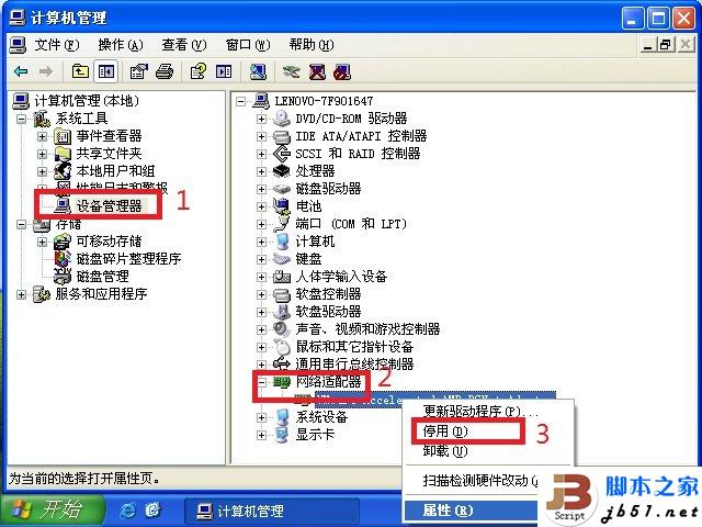 在弹出窗口计算机管理中选择“设备管理器”,查看右侧“网络适配器”,根据BOM中无线网卡型号选择对应的无线网卡(如:BCM、intel或802.11等字样),右键选择该设备单击禁用即可。如下图所示