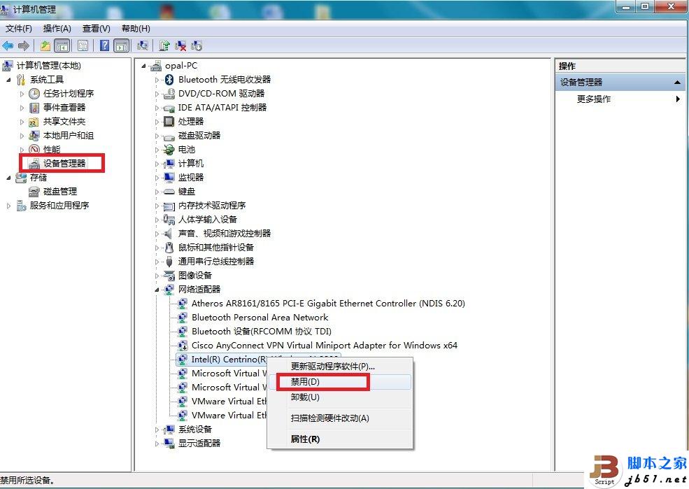 在弹出窗口计算机管理中选择“设备管理器”,查看右侧“网络适配器”,根据BOM中无线网卡型号选择对应的无线网卡(如:BCM、intel、realtek或802.11等字样),右键选择该设备单击禁用即可。如下图所示: