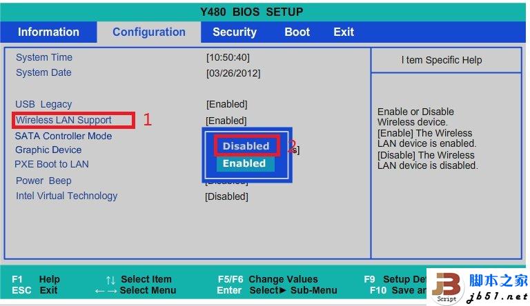 注:若为笔记本,大部分机型可以在BIOS中禁用无线网卡。参考BIOS虚拟页面(下图以Y480BIOS为例):http://10.99.109.13/webtools/