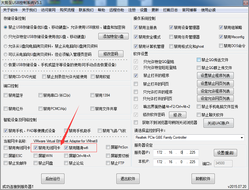 http://www.grabsun.com/monitorusb.html),是一款禁止U盘使用、禁止USB存储设备的使用,并且还可以禁止登录网盘、禁止邮件上传附件、禁止QQ发送文件以及禁止FTP文件上传等,防止通过各种途径泄密的行为。大势至USB控制系统集成了禁用无线网卡、禁用随身wifi的功能,只需要勾选就可以实现,如下图所示: