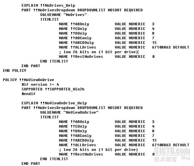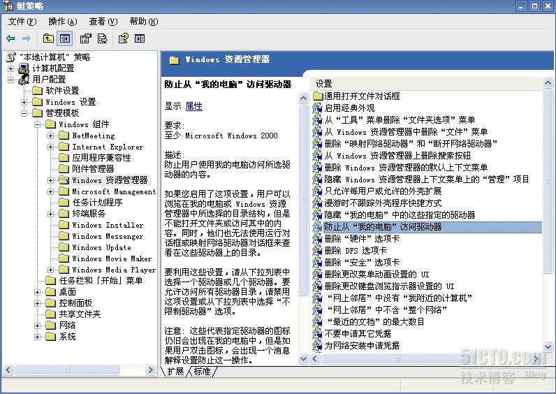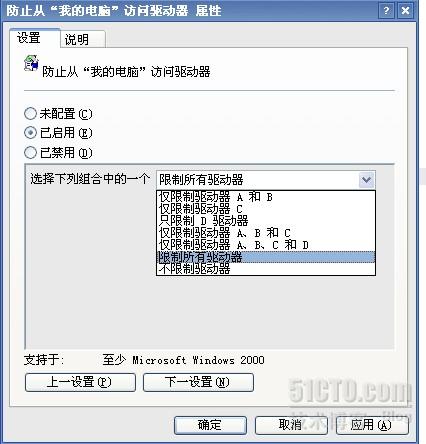 等于号后引号内的说明您可以根据自己的喜好定义,它将会显示在如图2的下拉框中。保存后,打开“屏蔽U盘”策略,定位“用户配置-管理模板-Windows 组件-Windows 资源管理器”,在右边的窗口中双击“隐藏我的电脑中的这些指定的驱动器”或“防止从我的电脑访问驱动器”其中的一个,点击“启用”,再点击下拉框,哈哈,您会发现您多了一个选项(如图4)。