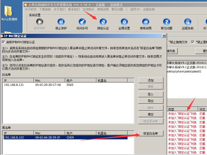 排查2、在大势至共享文件管理系统界面上启用了“绑定认证”,并且没有将访问者的电脑加入到绑定列表。如下图所示: