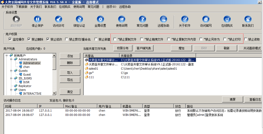 排查1、是否启用了大势至共享文件管理软件的“高级功能”,但却没有启用客户端。