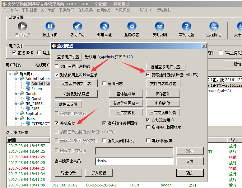 你可以手动启动大势至共享文件管理系统,或者你也可以设置开机自动运行本系统(但是你依然需要输入服务器的账号和密码登录进去服务器才可以)。注意你需要勾选:开机启动、默认使用上次账号登录两个选项,如果你还想隐藏运行,则还需要勾选“隐藏运行”,然后开机后就自动隐藏运行了,这个时候按下热键alt+f3,输入默认密码dszdsz就可以唤出软件界面了。如下图所示: