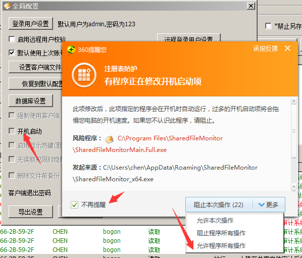 此外,如果你的电脑安装了360安全卫士,则当你勾选“开机启动”时如果被360安全卫士拦截,则需要勾选“不再提醒”,并选择“允许程序所有操作”等,这样才可以保证可以成功勾选开机启动,否则就会出现无法在“开机启动”前面打勾的情况(打上马上消失)。如果无法打勾了,则你可以退出360安全卫士然后再勾选“开机启动”就可以了。、