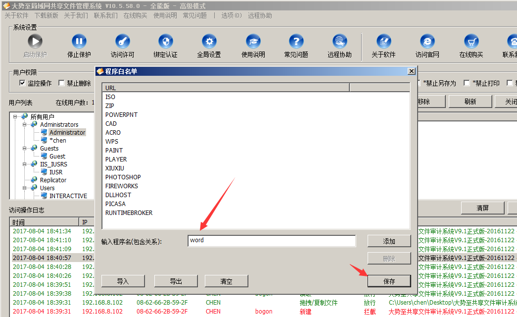 这种情况下,通常是由于访问者所使用的工具没有加入到“访问许可”列表,然后被大势至共享文件管理系统拦截导致的。之所以对其进行拦截,是为了防止用户使用某些软件访问共享文件绕过系统监控的情况,这种情况下只需要将被拦截的程序加入到“访问许可”列表即可。如下图所示: