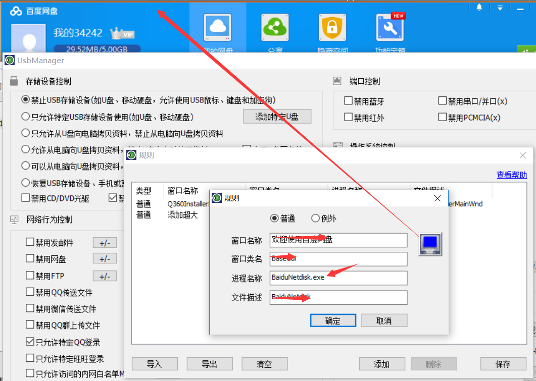 但是,由于网盘有客户端。用户还可能通过网盘客户端上传文件的行为。因此,我们还需要禁止网盘客户端上传文件的行为。由于这种方式不是通过网页上传文件,因此无法阻止用户通过“打开”或“浏览文件夹”的方式上传文件。因此,为了安全起见,我们可以完全禁用网盘客户端的使用。我们以“百度网盘”为例,勾选“禁止打开的程序”,然后点击“添加”,然后拖动放大镜到百度网盘客户端软件的顶部,然后程序就可以读取其窗口名称、类名、进程名字或描述。我们可以把其他的删掉,只保留进程名字,然后添加即可。如下图所示: