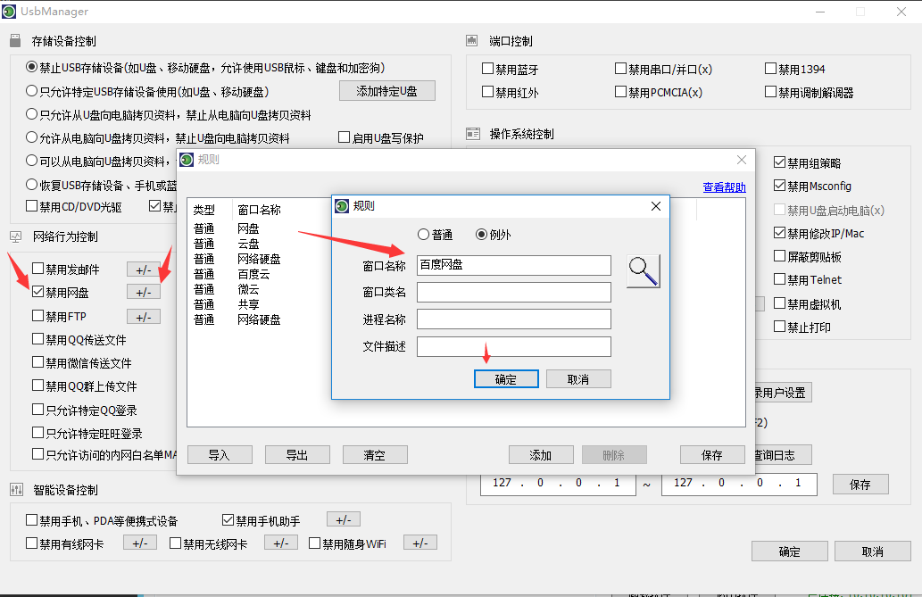 然后勾选“禁用网盘”,然后这里就可以设置网盘例外,也就是只让用户登录某个网盘,比如企业内部的网盘。我们以“百度网盘”为例,首先选择“例外”,然后在“窗口名称”这里输入“百度网盘”,然后点击下面的“确定”,即可成功设置只让登录百度网盘,只让打开百度网盘了。如下图所示: