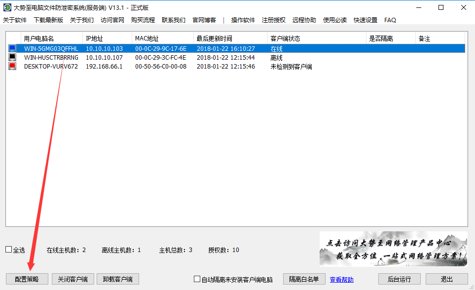 首先,你可以在管理端鼠标点击选中某个电脑,然后点击下面的“配置策略”,如下图所示: