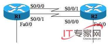 该拓扑结构拥有两个路由器,,每个路由器都具备两个串联接口和一个局域网接口。因为这样的路由廉价易得。你可以用两个2501路由器,两根串联的对头拼接的网线进行实验。或者是两个2610路由加两根对头拼接的网线也可以。或许,某些实验环境要求FastE接口而不是以太网接口。