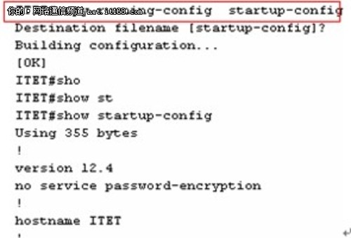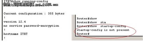 我们也可以通过命令来查看NVRAM中的配置文件,也就是保存在NVRANK中的配置文件 startup-config或者是查看RAM中的配置文件,也就是正在运行的配置文件。我们来看一下