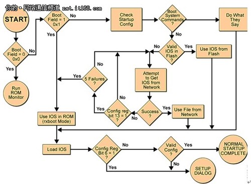 到这里我相信大家都能看的明白,下面咱们开始进行这一节的一个重点,详细分析一下路由器的启动流程图:如果大家把这个图看明白了,那么路由器的启动就没有问题了!