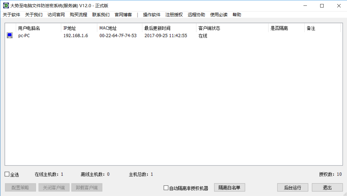 2、客户端一旦连接到管理端之后,就无法自行配置策略(会被管理端实时覆盖),也就是无法通过唤出软件界面,然后设置策略保存了,所有的策略配置必须在管理端进行,由管理端发送给客户端。