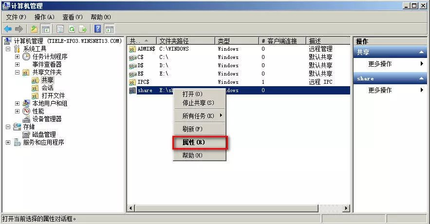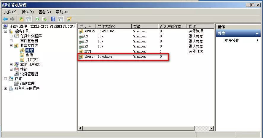 在【计算机管理】窗口中也可以看到e:\share文件夹已成功共享。