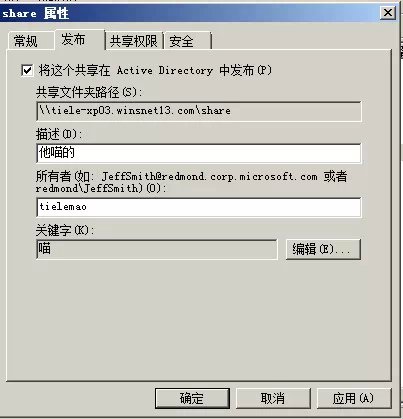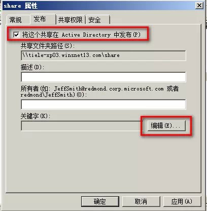 在【属性】对话框的【发布】选项卡下选中【将这个共享在Active Directory中发布】复选框,单击【编辑】按钮,在打开的对话框中输入描述、所有者及关键字