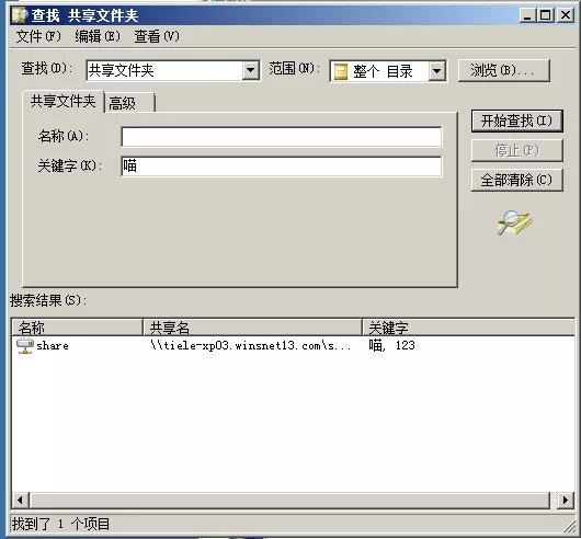 查找共享文件夹对话框中选择好查找共享文件夹,在【名称】文本框输入要查找的文件夹名,也可在【关键字】文本框输入关键字,单击【开始查找】按钮,在下方搜索结果中可以看到找到了刚刚发布的共享项目。