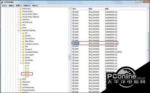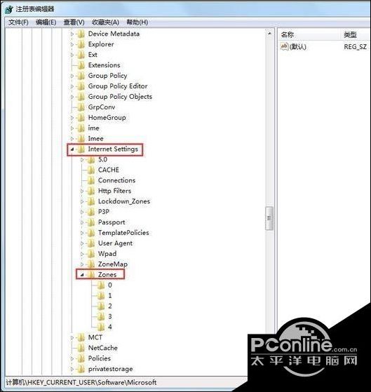 2、进入“注册表编辑器”窗口后,在左侧依次展开“HKEY_CURRENT_USER--Software--Microsoft--Windows--CurrentVersion--Internet Settings--Zones”;