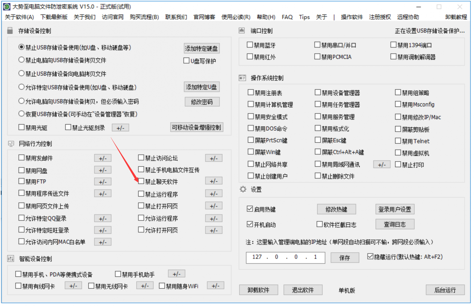 大势至电脑文件防泄密系统(较新版下载地址:http://www.grabsun.com/download/dszusb.7z)集成了全面的聊天软件使用控制功能,可以从多个维度实现对聊天软件的控制,具体来说: