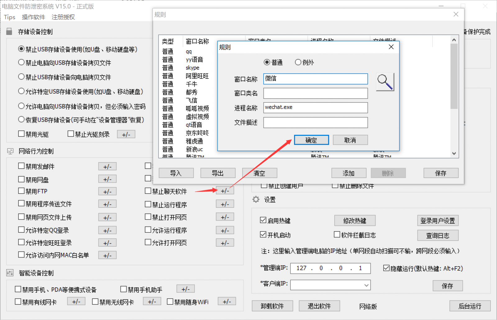 在大势至电脑文件防泄密系统上直接勾选“禁止聊天软件”,就可以禁止当前所有主流的聊天软件,例如QQ、微信、阿里旺旺、skype、钉钉等等,同时还支持管理员自行添加聊天软件,如下图所示:
