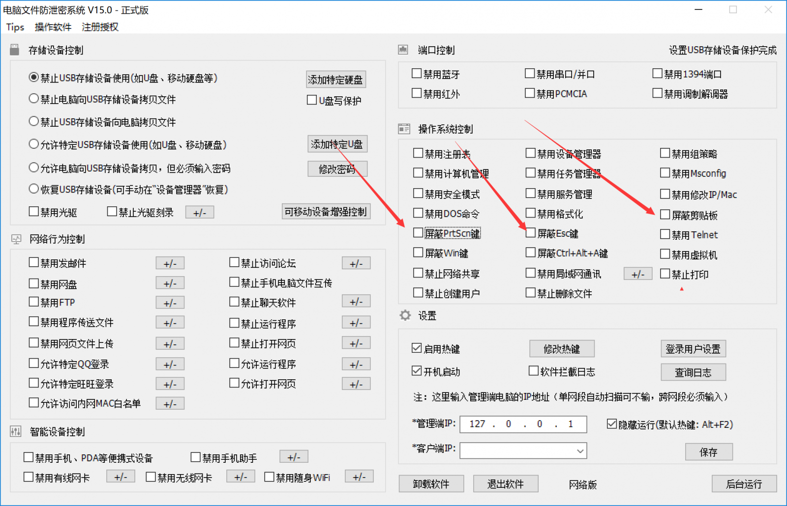 较后,我们还可以禁止聊天软件截图。具体需要勾选两个选项即可:“禁止ctrl+alt+a”键”、“屏蔽prtscn”和“屏蔽剪切板”两个功能,就可以禁止聊天软件截图了。如下图: